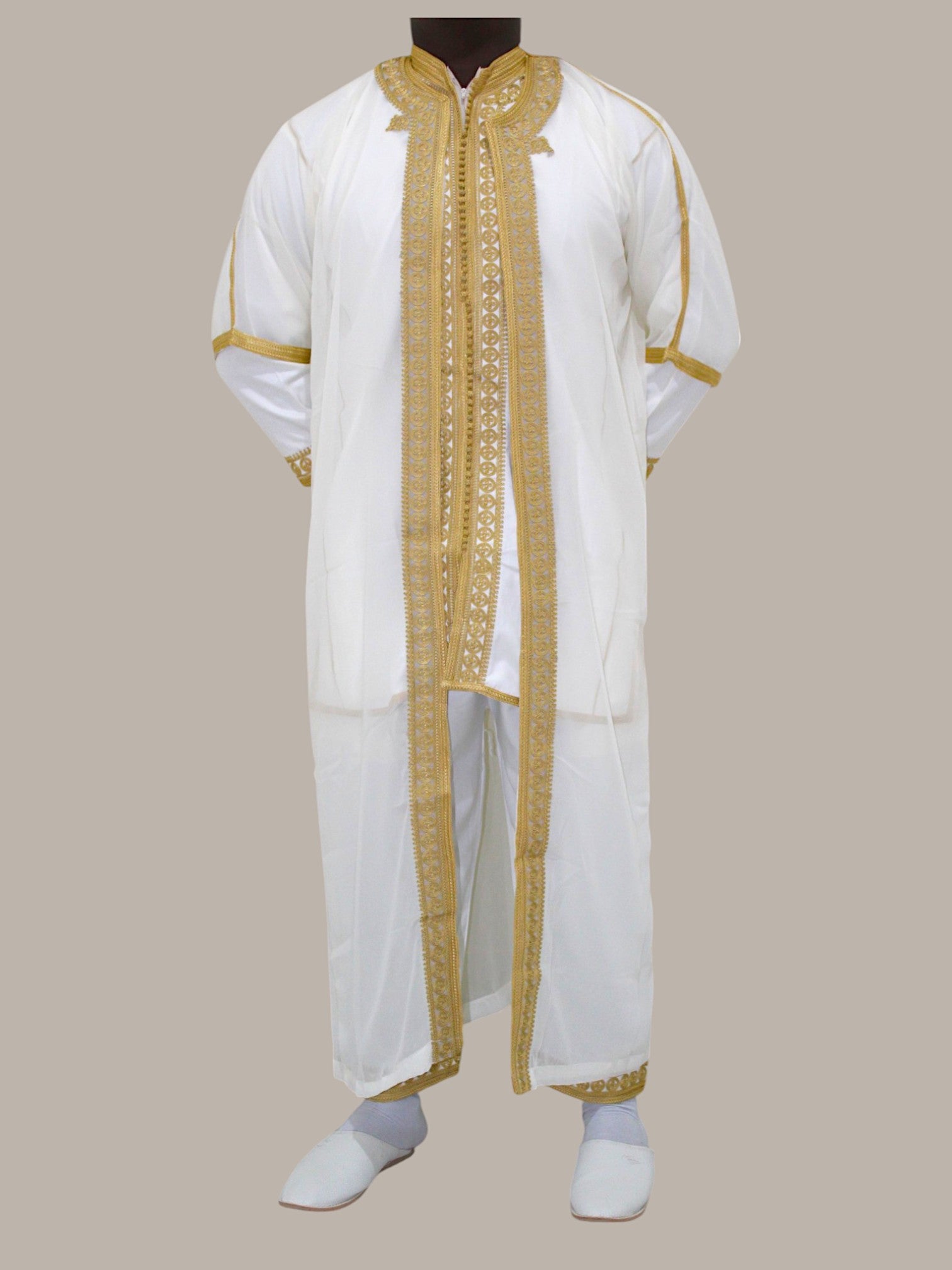 Idéal pour l’Aïd, un mariage ou toute cérémonie importante, ce modèle s’impose par sa noblesse discrète. À porter avec des babouches blanches ou dorées pour un style complet.